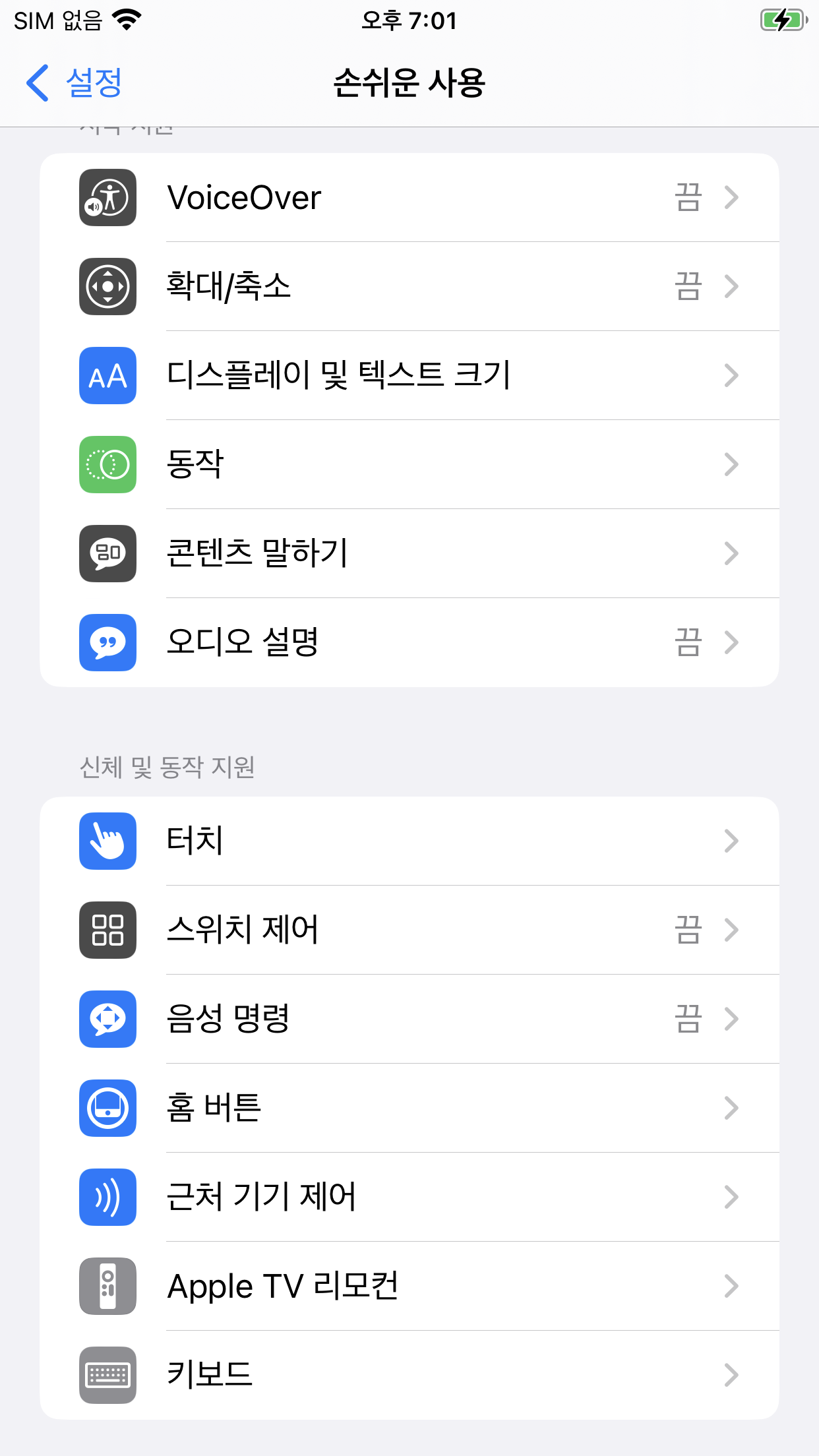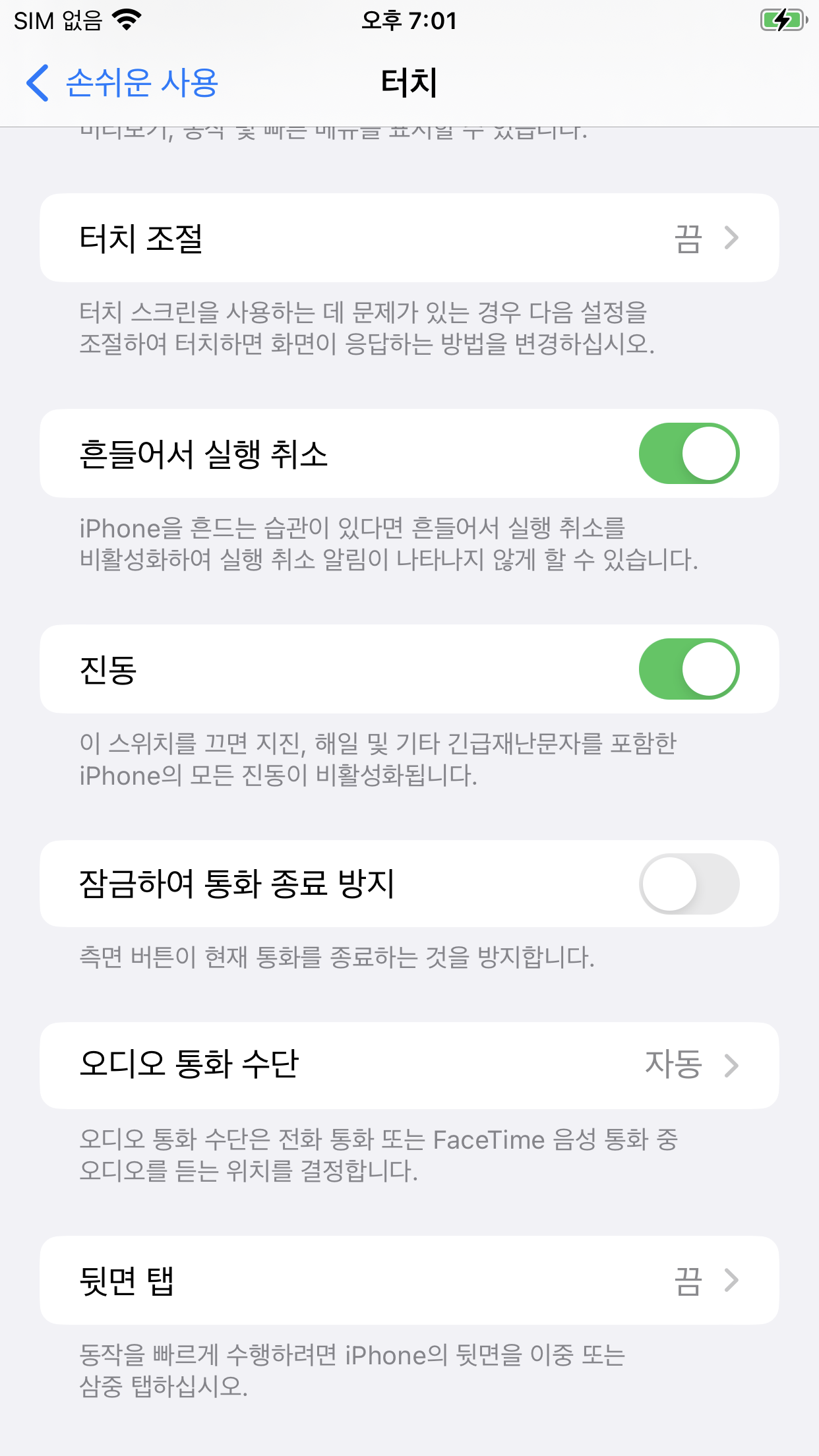손쉬운 사용 - 터치 에서 진동 옵션이 OFF 로 되어 있나 확인