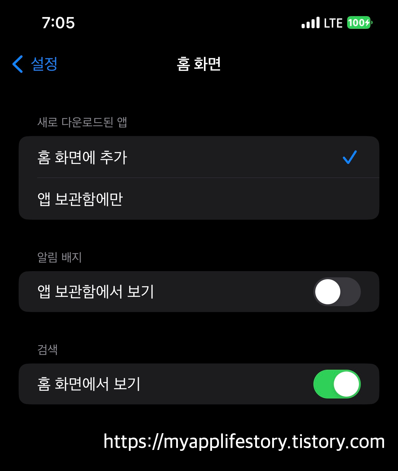"홈 화면에서 보기" 항목이 있는데 여길 ON/OFF 해주면